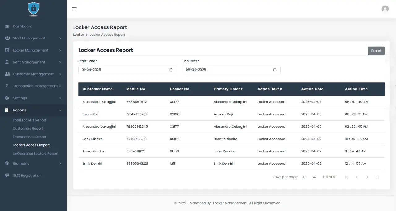 Automates locker assignment and monitors usage history, availability, and real-time status of each locker.